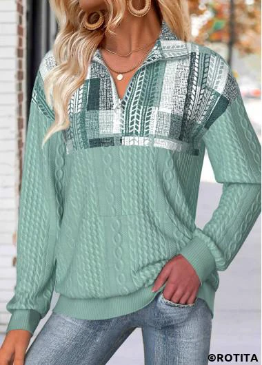 Maison > Hauts > sweats et sweats à capuche/ Sweat-shirt à manches longues vert sauge à imprimé géométrique couvrant le ventre Rotita
