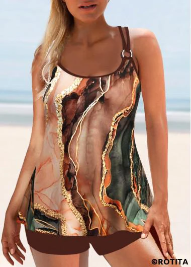 ensemble de tankini à imprimé marbre café foncé avec anneau circulaire Rotita