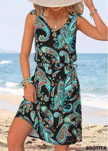Nouvelle dans Robe courte noire à col en V et imprimé cachemire Rotita couvrant le ventre