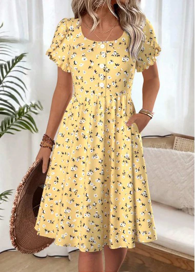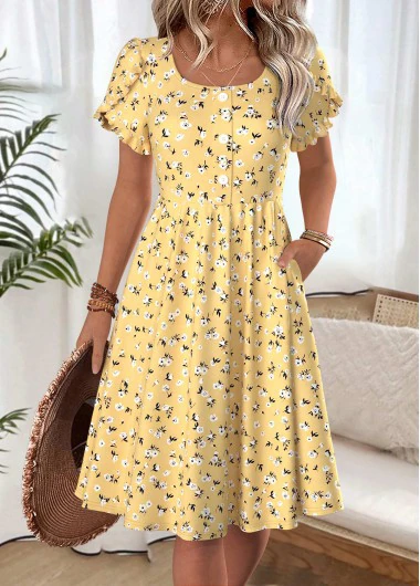 robe jaune à manches courtes et col bateau à imprimé floral Rotita