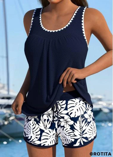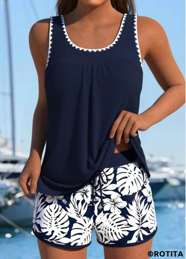 Maison > Maillots de bain > Tankinis > Ensembles Tankini/ Ensemble tankini taille mi-haute à imprimé floral bleu marine Rotita couvrant le ventre