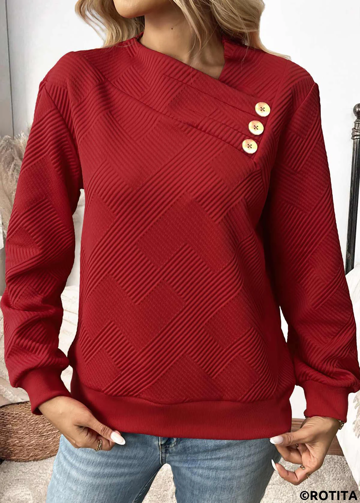 sweat-shirt à manches longues et col asymétrique rouge vin à boutons Rotita
