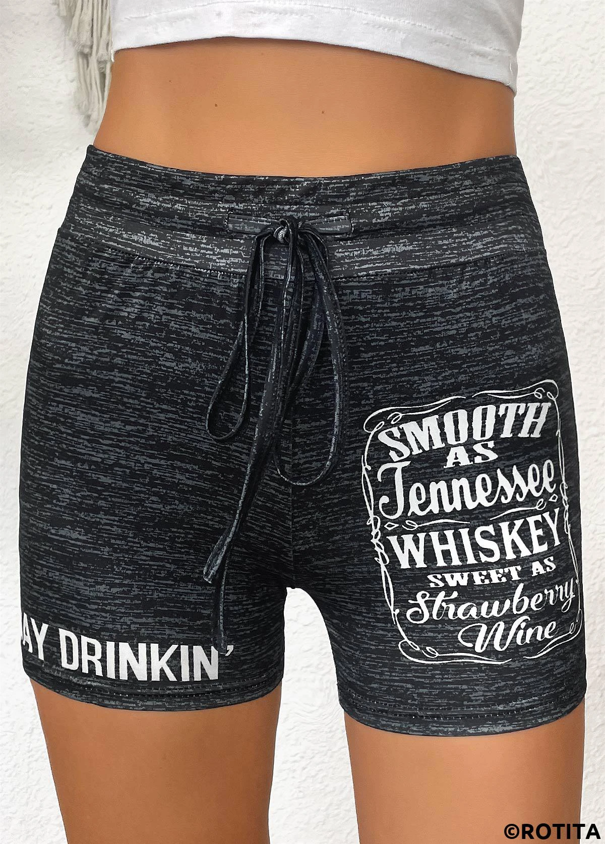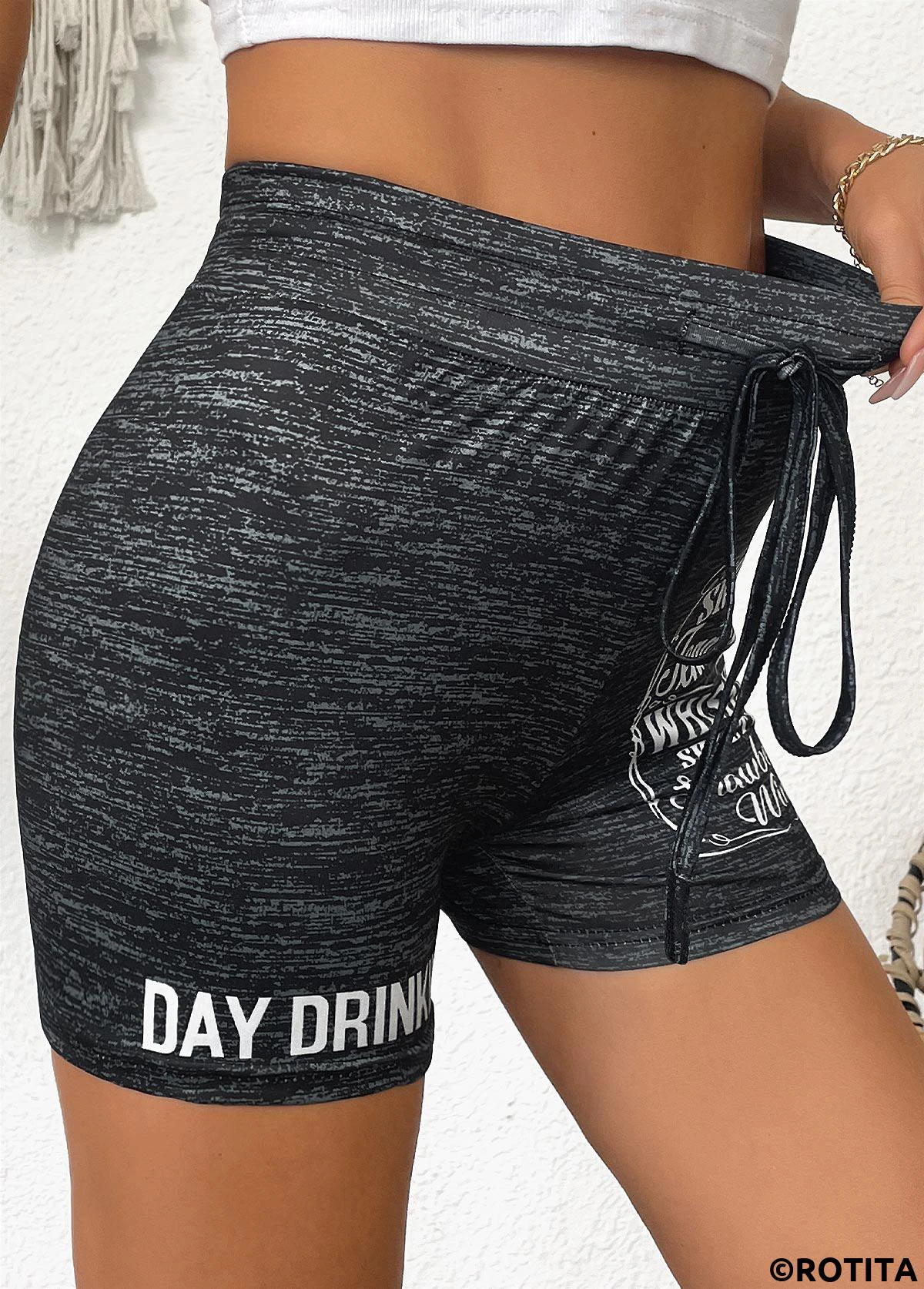 Letter Print Black Skinny Drawastring High Waisted Shorts