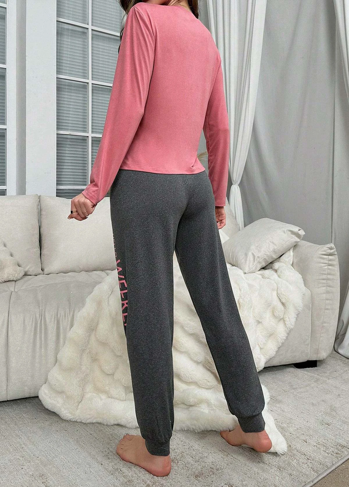 Home > Loungewear > Loungewear Sets/ Letter Print Pink Round Neck Lounge Top and Pants