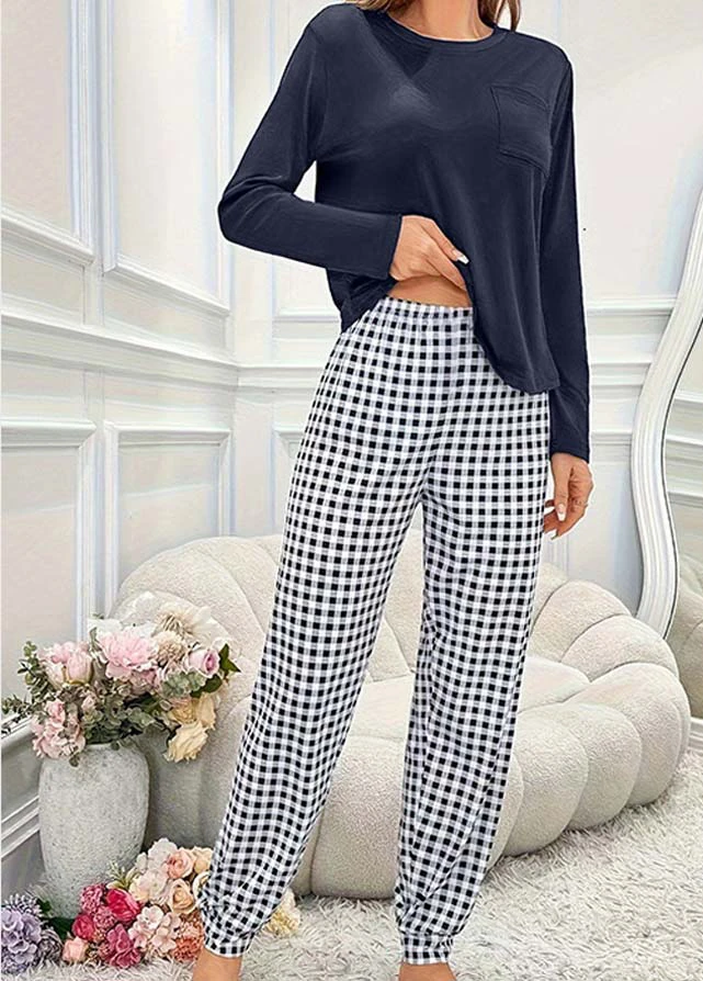 Home > Loungewear > Loungewear Sets/ Plaid Navy Round Neck Lounge Top and Pants