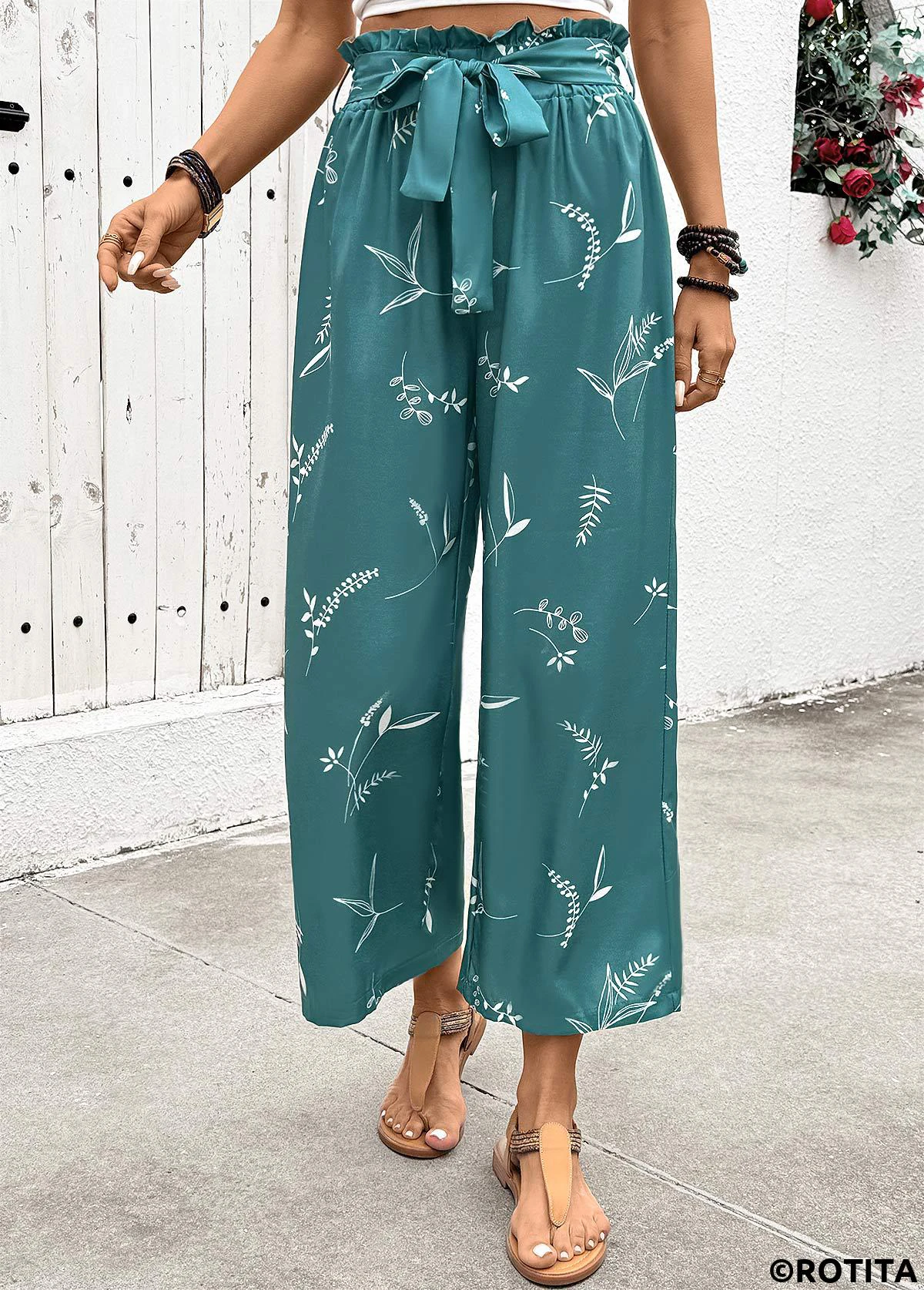 Home > Bottoms > Pants/ Plants Print Turquoise Wide Leg Elastic Waist Pants