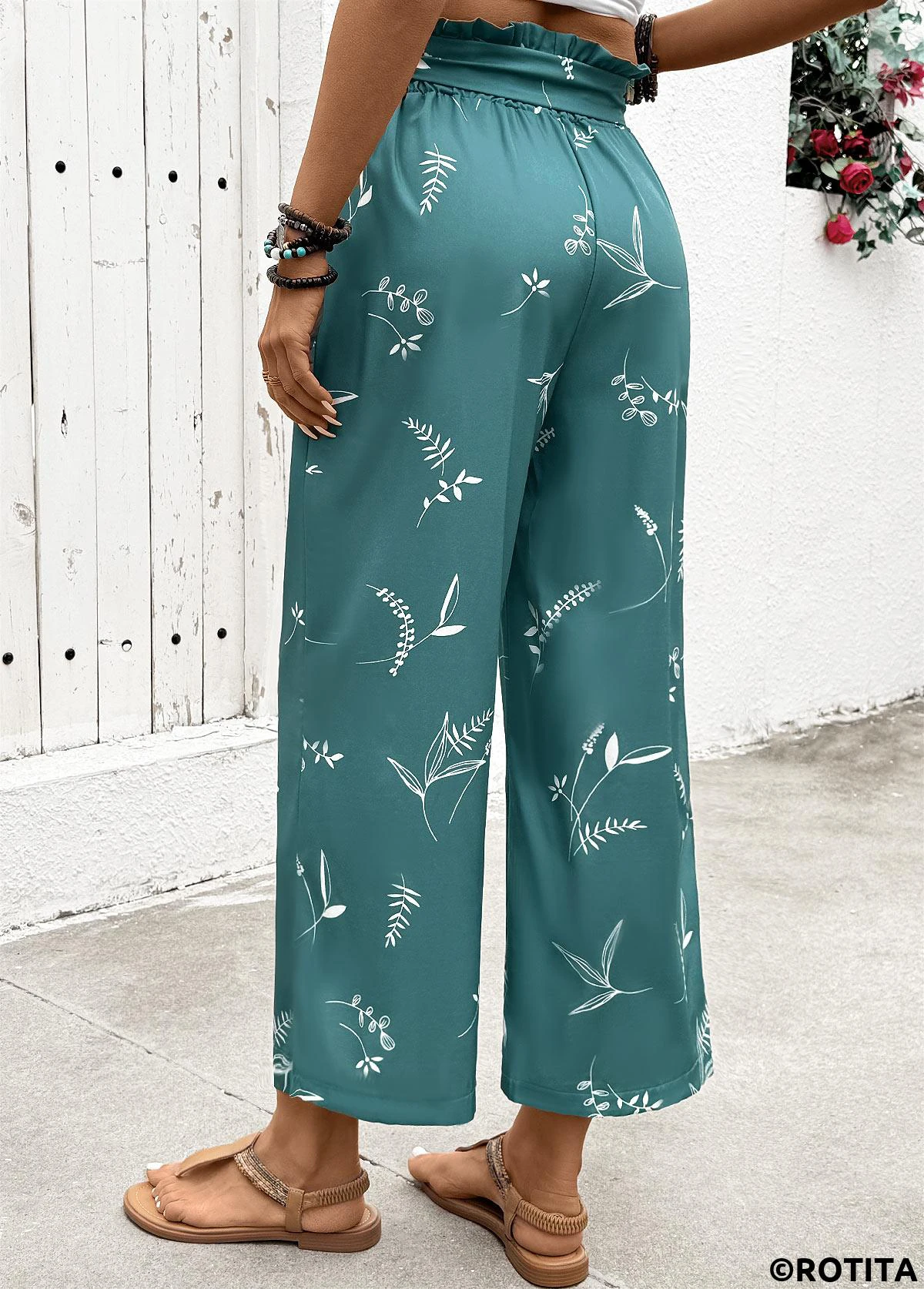 New In Plants Print Turquoise Wide Leg Elastic Waist Pants