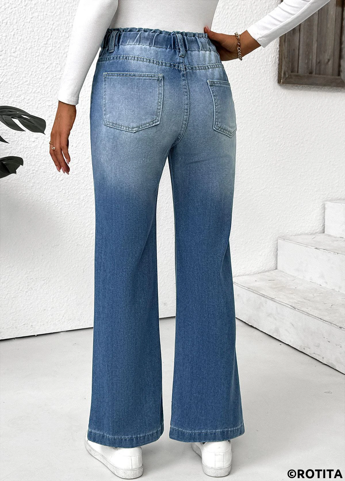 Pocket Light Blue Wide Leg Elastic Waist Pants