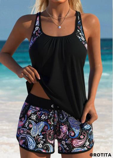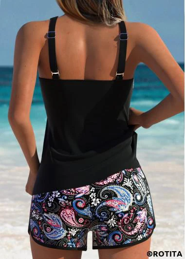 ROTITA Black Patchwork Tribal Print Mid Waisted Tankini Set
