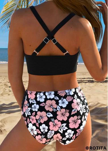 ROTITA Black Surplice Floral Print Mid Waisted Bikini Set