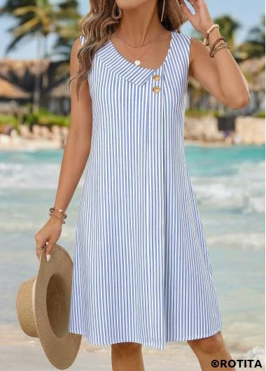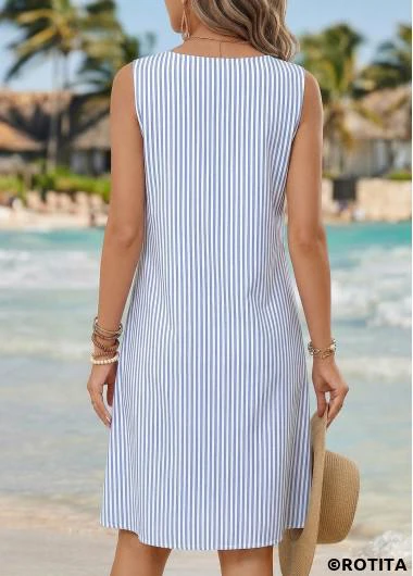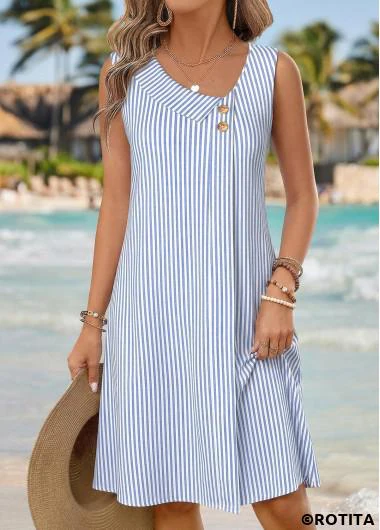 Home > Dresses/ ROTITA Blue Striped Asymmetry Asymmetrical Neck Sleeveless Dress