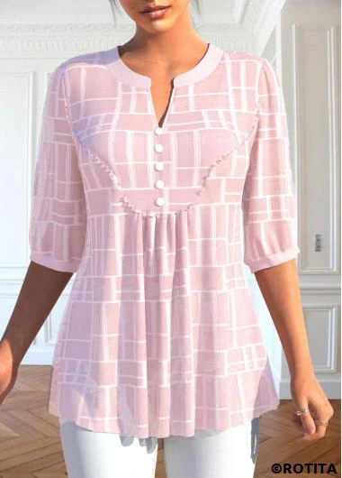 Sale ROTITA Button Light Pink Split Neck 3/4 Sleeve Blouse