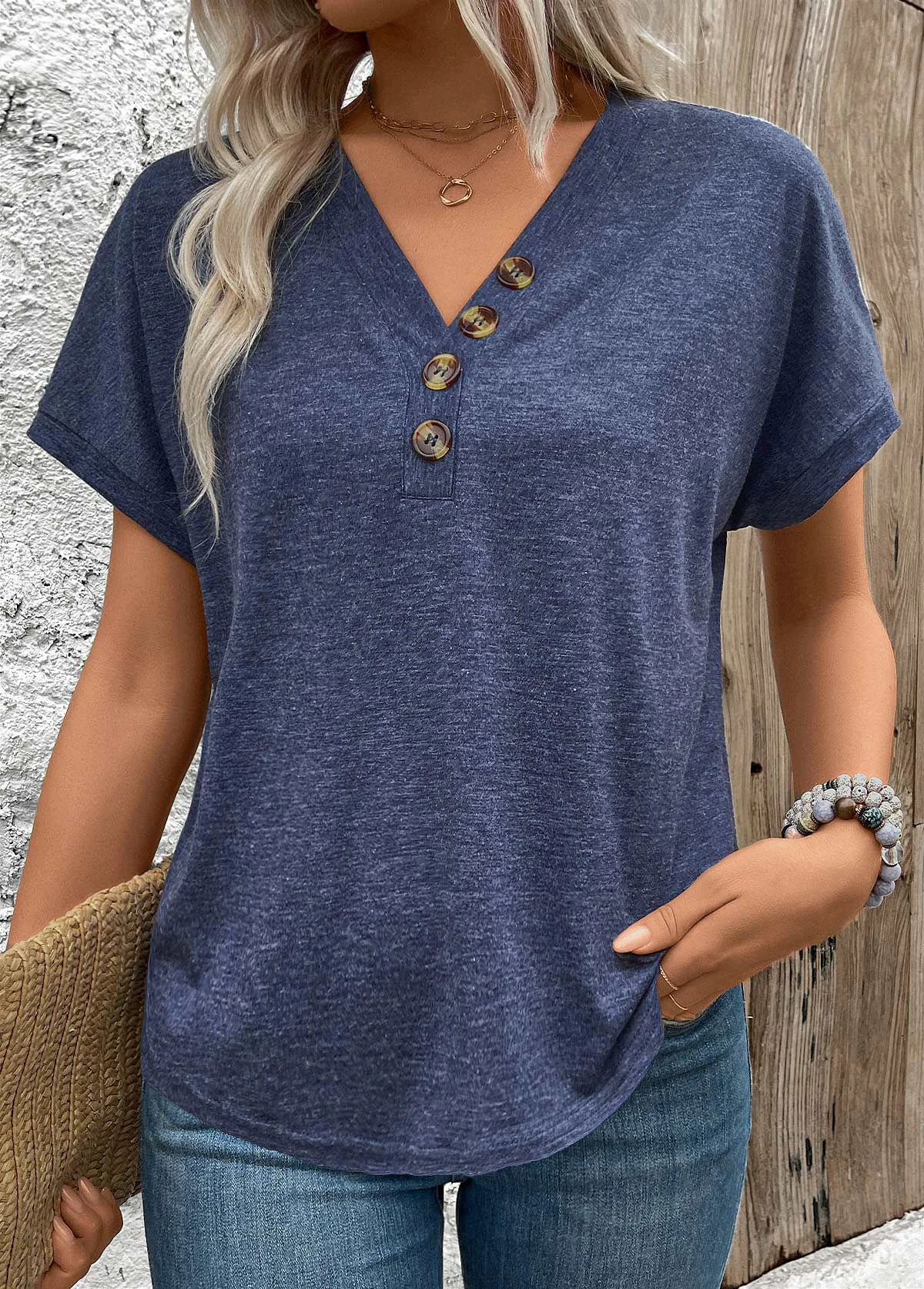 Sale ROTITA Button Navy V Neck Short Sleeve Blouse