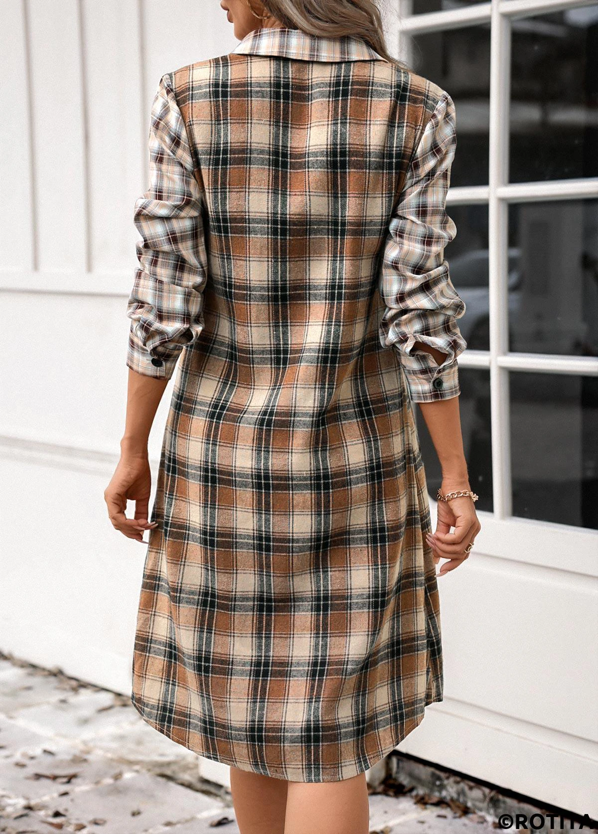Home > Dresses/ ROTITA Button Plaid Dark Coffee A Line Shirt Collar Dress