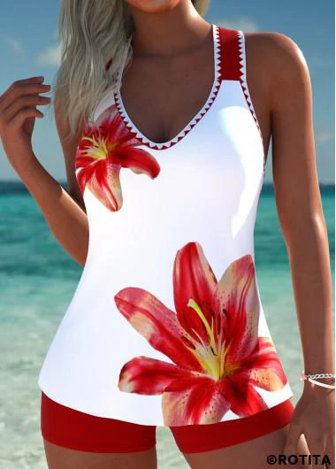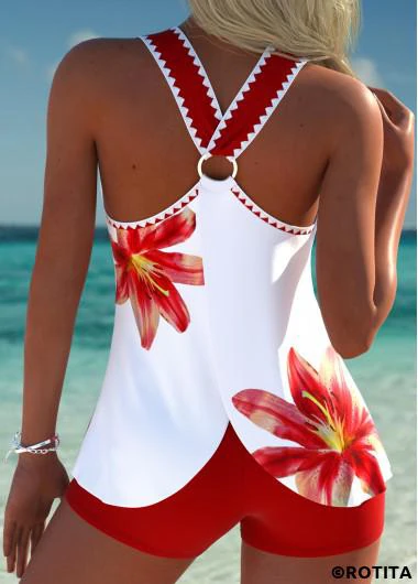 ROTITA Circular Ring Red Tropical Plants Print Tankini Set