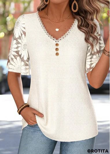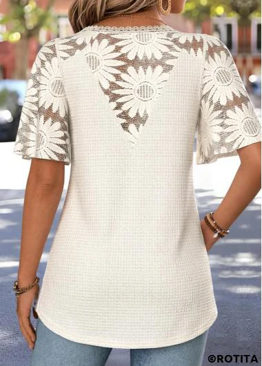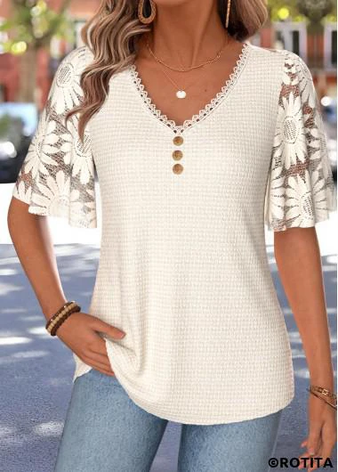 Home > Tops > Tees&T-shirts/ ROTITA Curved Hem Beige V Neck Half Sleeve T Shirt