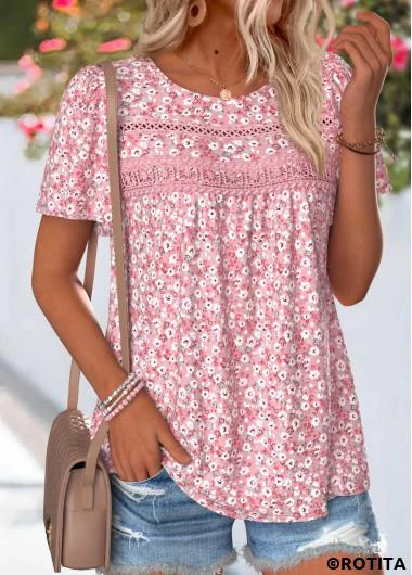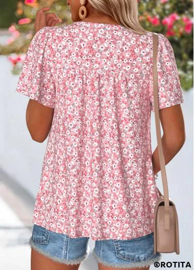 ROTITA Curved Hem Ditsy Floral Print Pink T Shirt