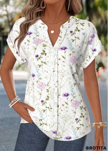 Home > Tops > Blouses/ ROTITA Curved Hem Floral Print Raw White Split Neck Blouse