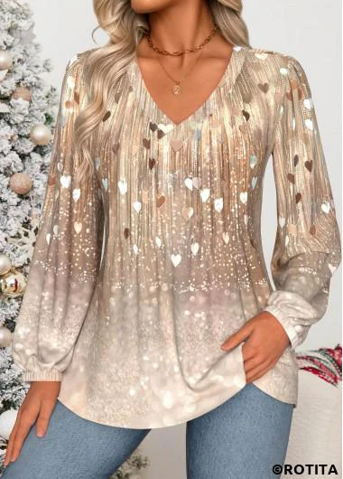 Home > Tops > Blouses/ ROTITA Curved Hem Heart Print Skin Color V Neck Blouse