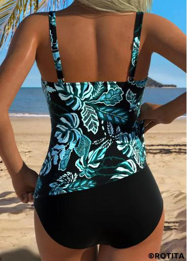 Home > Swimwear > Tankinis > Tankini Tops/ ROTITA Cyan Tummy Coverage Tropical Plants Print Tankini Top-No Bottom
