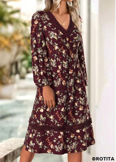 ROTITA Floral Print Deep Red V Neck Long Sleeve Dress