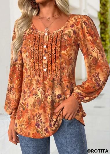 Home > Tops > Blouses/ ROTITA Frill Floral Print Terracotta Round Neck Long Sleeve Blouse