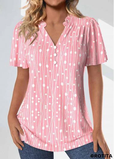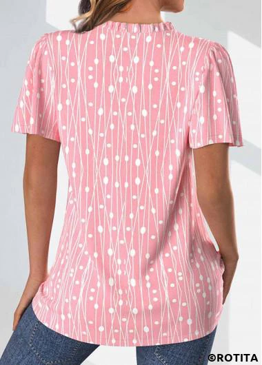 Function:Tummy Coverage Selling Point:Frill,Shirred Package Contents:1 X Blouse Color:Pink Printing Design:Geometric,Dot,Striped, Print Placement Will Vary Clothing Length:Tunic Sleeve's Length:Short Sleeve Neckline:Split Neck Sleeve Style:Flared Sleeve Placket Style:Pull On/Pullover Style:Casual Occasion:Everyday Composition:97% Polyester 3% Spandex Washing Instructions:Hand Wash/Machine Wash