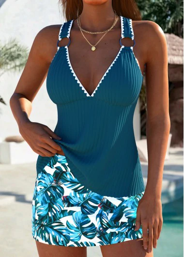 Home > Swimwear > Tankinis > Tankini Sets/ ROTITA Lace Up Peacock Blue Plants Print Tankini Set