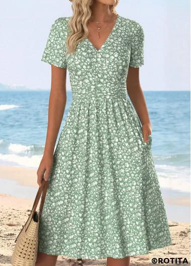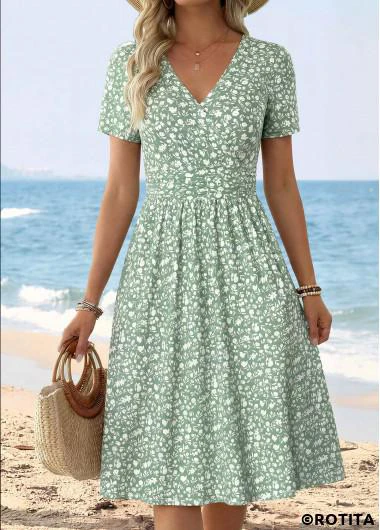 Home > Dresses/ ROTITA Light Green Ditsy Floral Print Surplice V Neck Dress