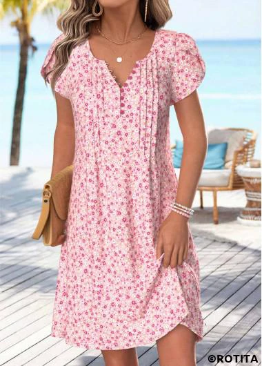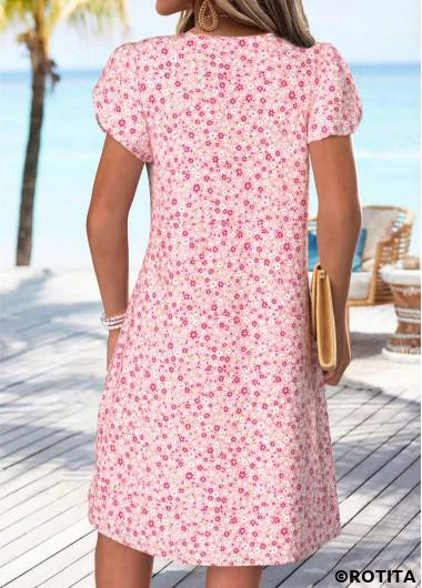 Home > Dresses/ ROTITA Light Pink Ditsy Floral Print Tuck Stitch Short Dress