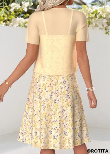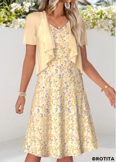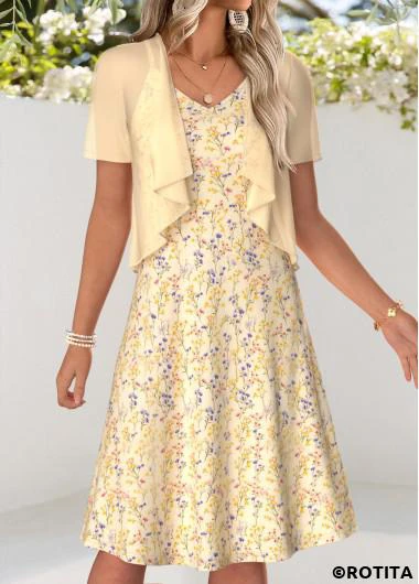 Function:Flowy,Tummy Coverage Package Contents:1 X Dress , 1 X Cardigan Color:Light Yellow Printing Design:Ditsy Floral, Print Placement Will Vary Clothing Length:Knee Length Sleeve's Length:Short Sleeve Neckline:V Neck Sleeve Style:Regular Sleeve Placket Style:Side Zip Style:Vacation Occasion:Vacation Composition:95% Polyester 5% Spandex Washing Instructions:Hand Wash Selling Point:Soft,Two-Piece
