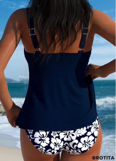 ROTITA Navy Tummy Coverage Tropical Plants Print Tankini Set