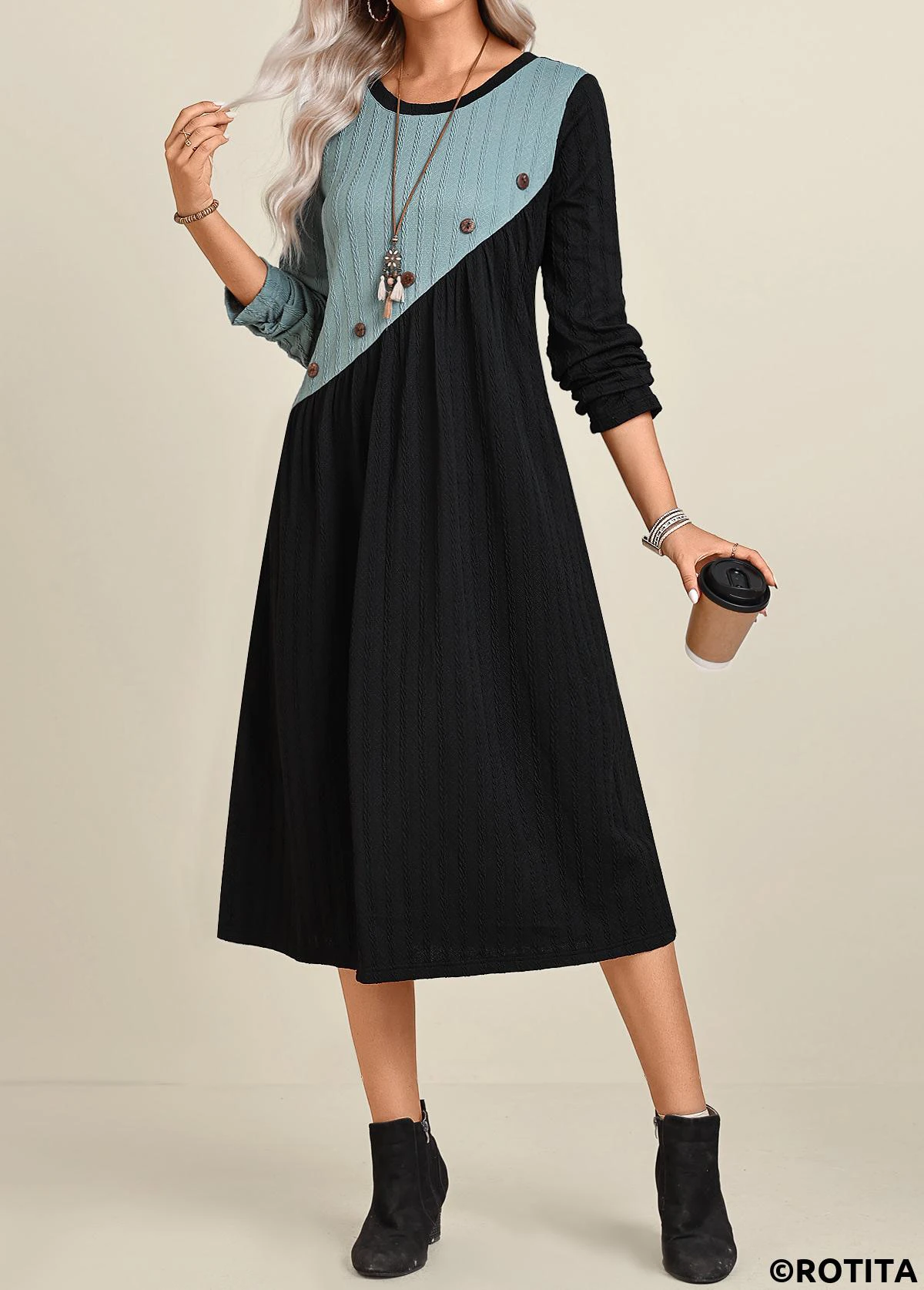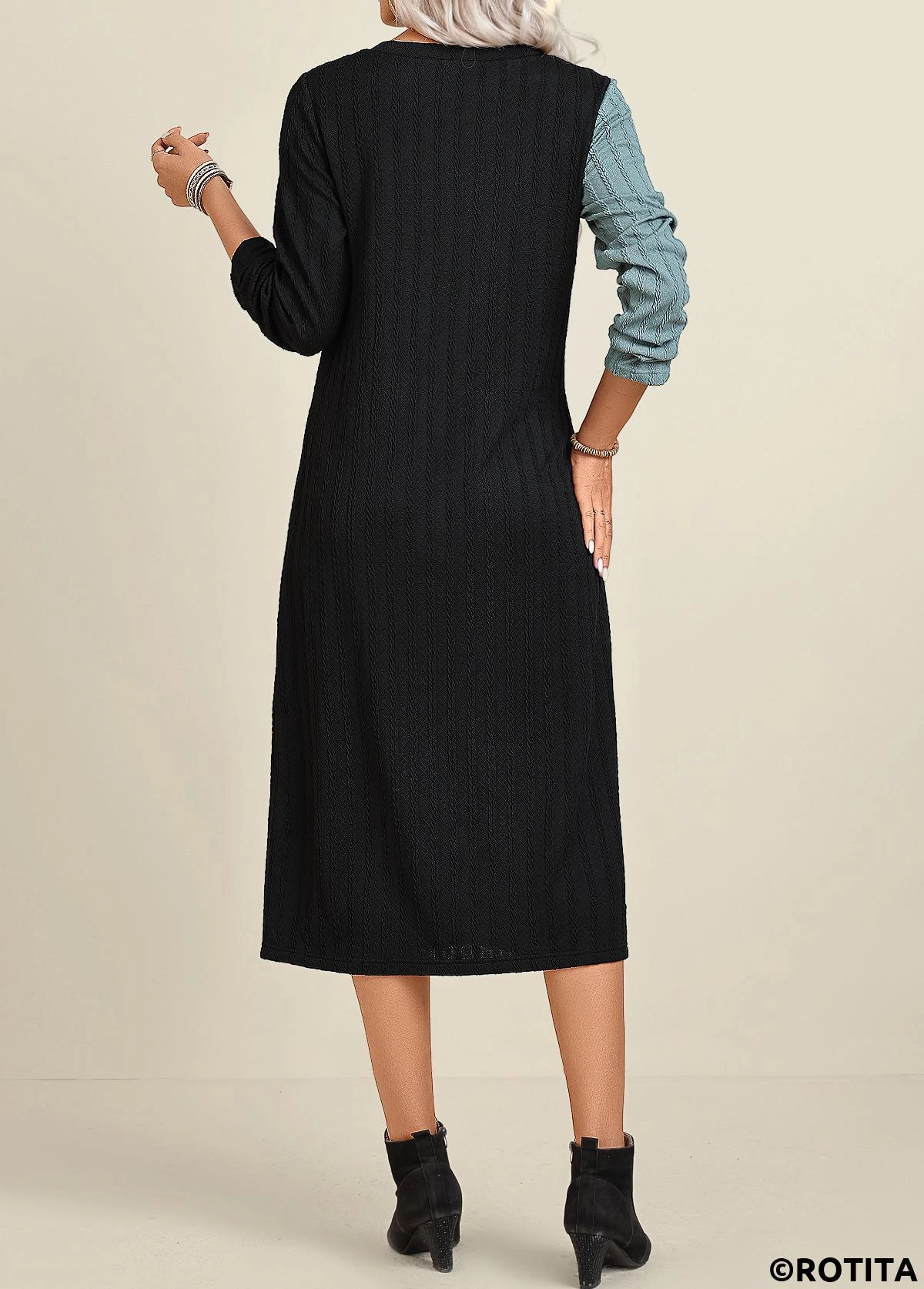 Home > Dresses/ ROTITA Patchwork Black A Line Round Neck Long Sleeve Dress