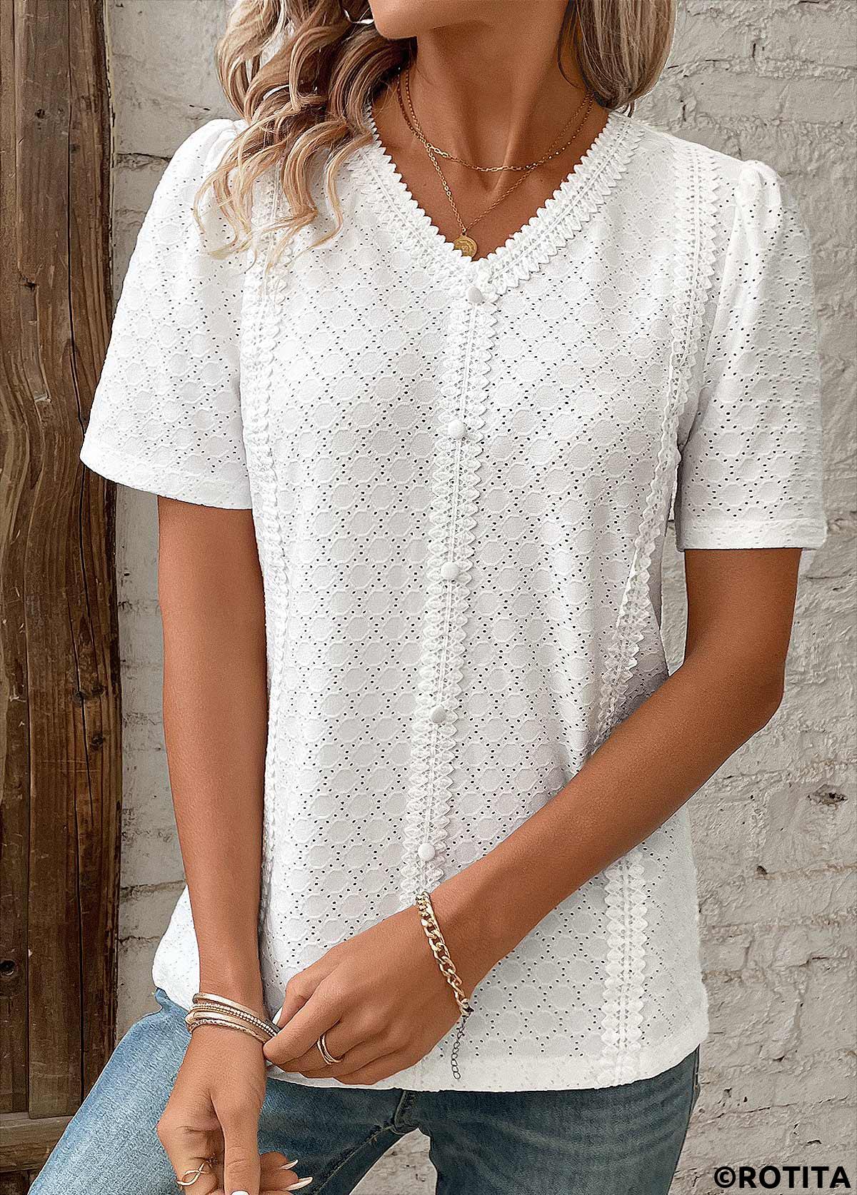 Step into elegance with our soft, V-neck white short-sleeved blouse. Crafted from delicate jacquard fabric, it features intricate lace patchwork detailing for a touch of sophistication. Perfect for any occasion, this blouse effortlessly combines comfort with style, making it a versatile addition to your wardrobe.