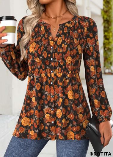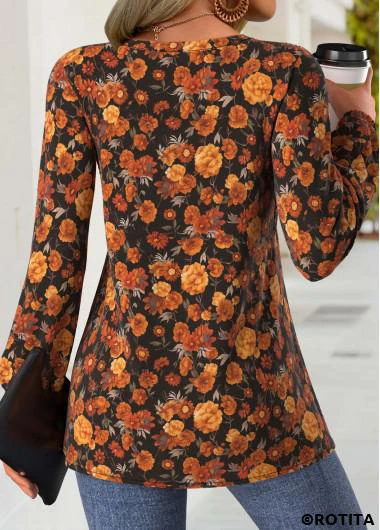 ROTITA Peplum Floral Print Terracotta Split Neck Long Sleeve Blouse