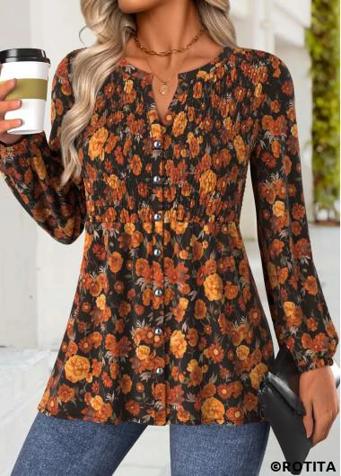 Home > Tops > Blouses/ ROTITA Peplum Floral Print Terracotta Split Neck Long Sleeve Blouse