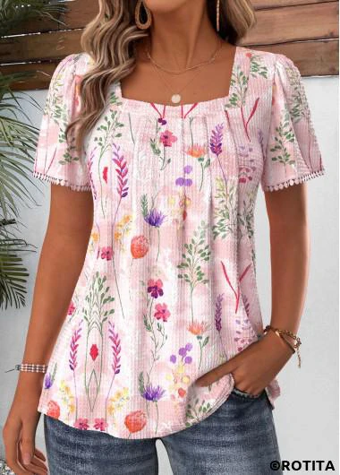 Home > Tops > Tees&T-shirts/ ROTITA Pleated Floral Print Light Pink Square Neck T Shirt