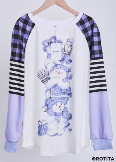 Sale ROTITA Plus Size Patchwork Light Purple Snowman Print T Shirt
