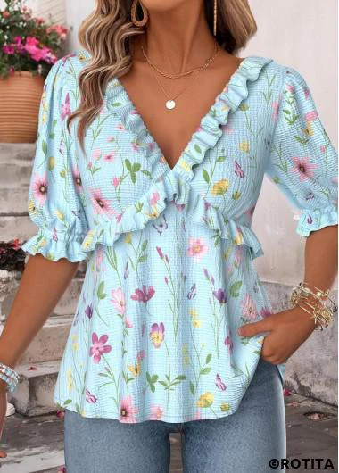 Home > Tops > Blouses/ ROTITA Ruffle Floral Print Light Blue V Neck Blouse