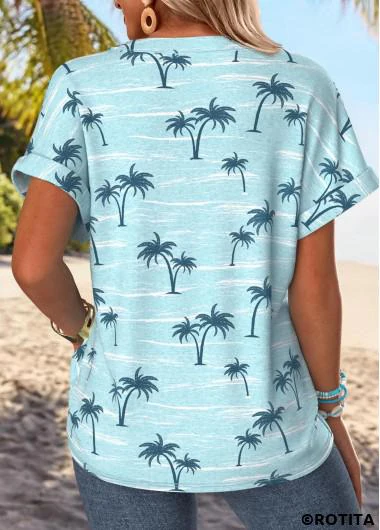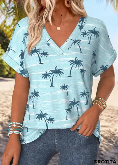 Home > Tops > Tees&T-shirts/ ROTITA Tropical Plants Print Blue V Neck T Shirt