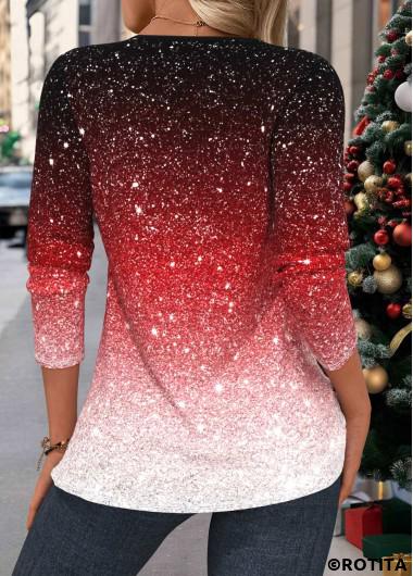 Home > Tops > Blouses/ ROTITA Tuck Stitch Ombre Red Split Neck Long Sleeve Blouse