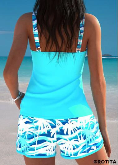 Home > Swimwear > Tankinis > Tankini Sets/ ROTITA Tummy Coverage Cyan Tropical Plants Print Tankini Set