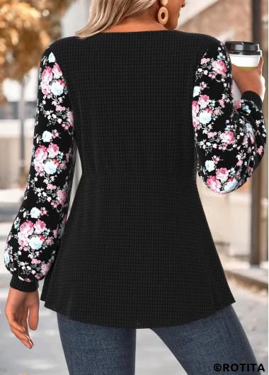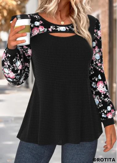 Function:Tummy Coverage Package Contents:1 X T Shirt Color:Black Printing Design:Floral,Plants, Print Placement Will Vary Clothing Length:Tunic Sleeve's Length:Long Sleeve Neckline:Round Neck Sleeve Style:Bishop Sleeve Placket Style:Pull On/Pullover Style:Casual Composition:95% Polyester 5% Spandex Washing Instructions:Hand Wash/Machine Wash Selling Point:Waffle texture,Cut Out,Curved hem,Layered