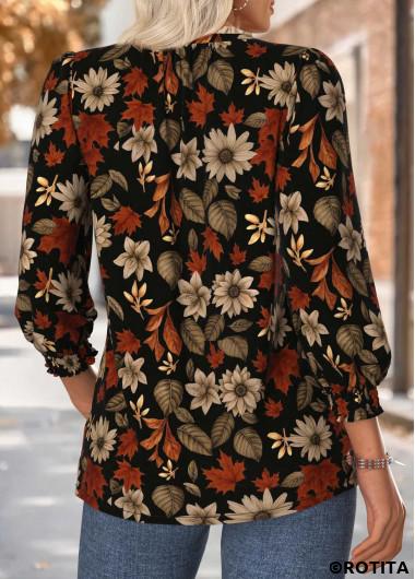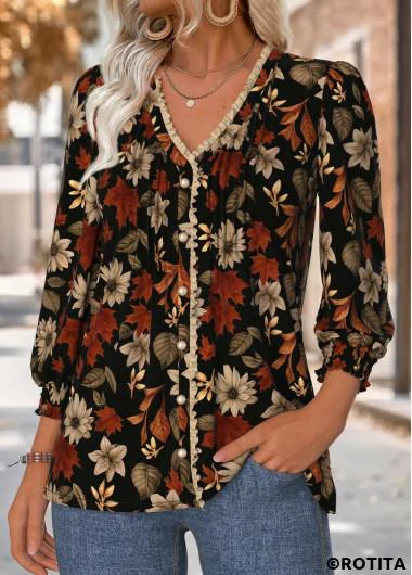ROTITA Tummy Coverage Floral Print Black V Neck Blouse