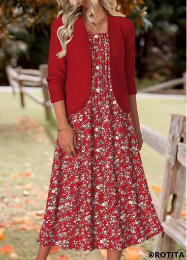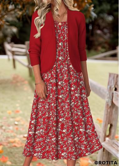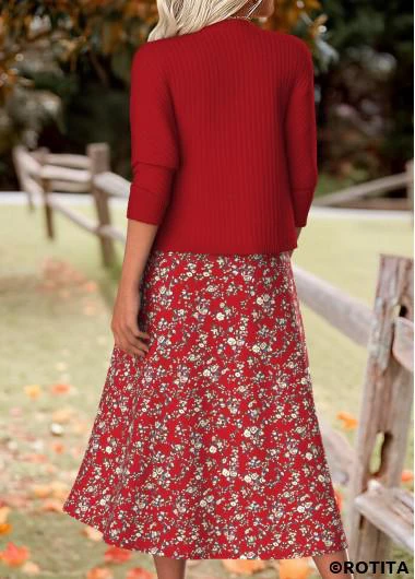Home > Dresses/ ROTITA Tummy Coverage Floral Print Wine Red Dress and Cardigan