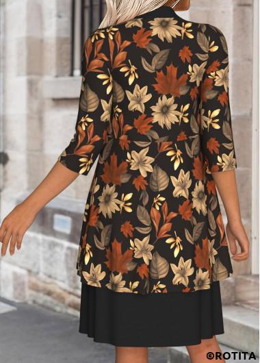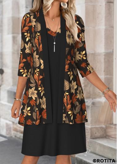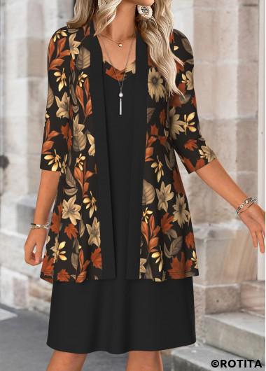 Home > Dresses/ ROTITA Tummy Coverage Leaf Print Black Dress and Cardigan