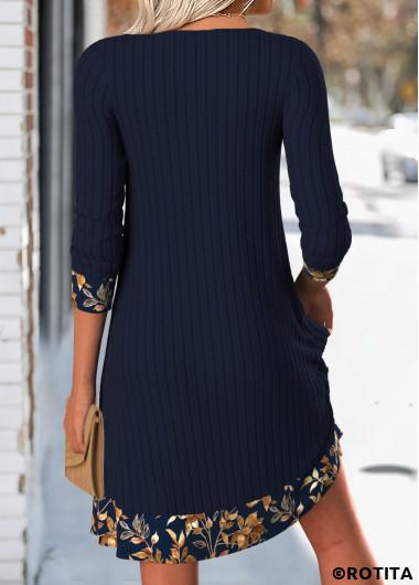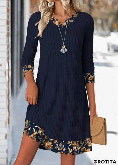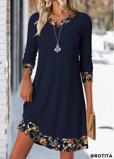 Home > Dresses/ ROTITA Tummy Coverage Leaf Print Navy Short V Neck Dress