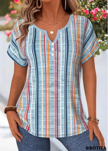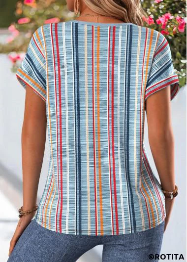 Home > Tops > Blouses/ ROTITA Tummy Coverage Multi Stripe Print Dusty Blue Blouse