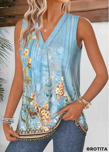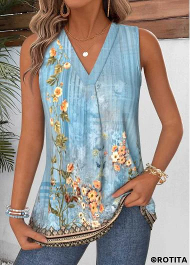 New In ROTITA Tummy Coverage Random Floral Print Dusty Blue Tank Top