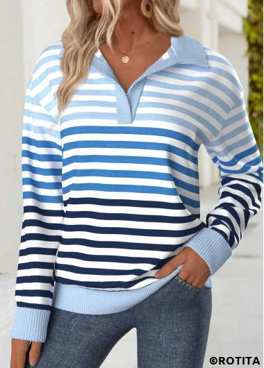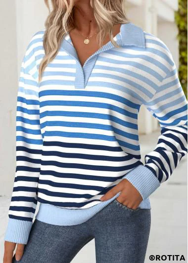 Home > Tops > Sweatshirts&Hoodies/ ROTITA Tummy Coverage Striped Blue Turn Down Collar Sweatshirt